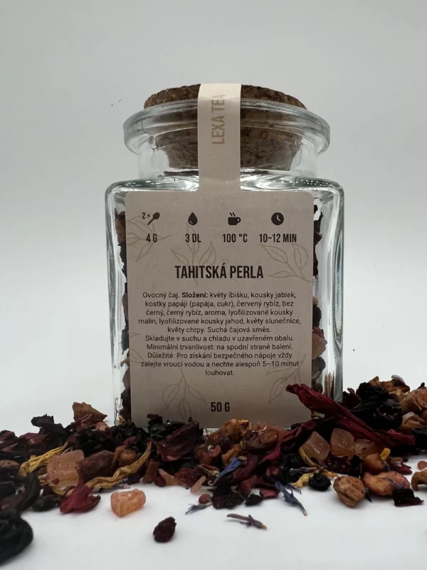 Složení: květy ibišku, kousky jablek, kostky papáji (papája, cukr), červený rybíz, bez černý, černý rybíz, aroma, lyofilizované kousky malin, lyofilizované kousky jahod, květy slunečnice, květy chrpy